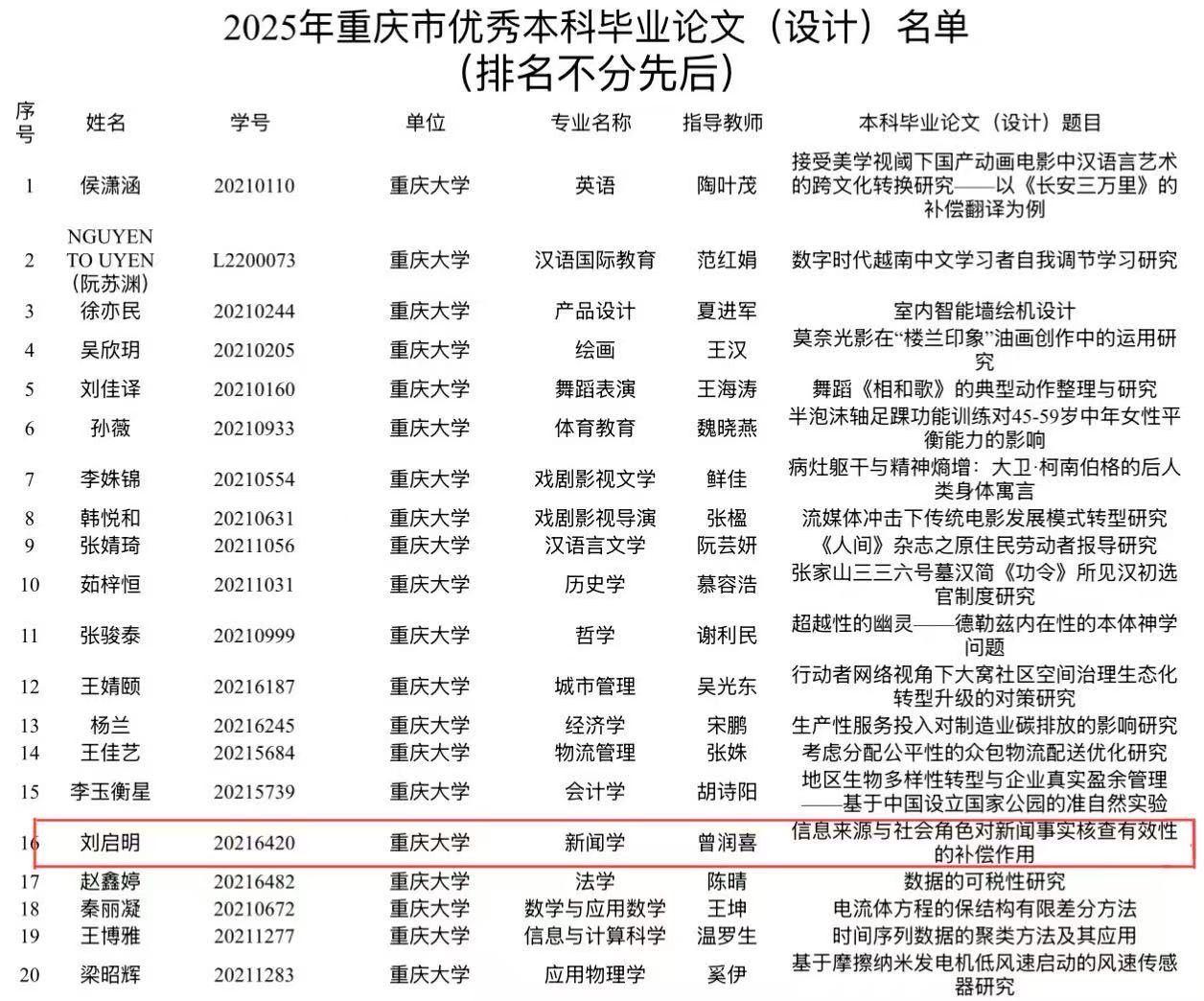 2021级新闻学专业本科生刘启明撰写的《信息来源与社会角色对新闻事实核查有效性的补偿作用》获评重庆市优秀本科生毕业论文,指导教师为曾润喜教授。