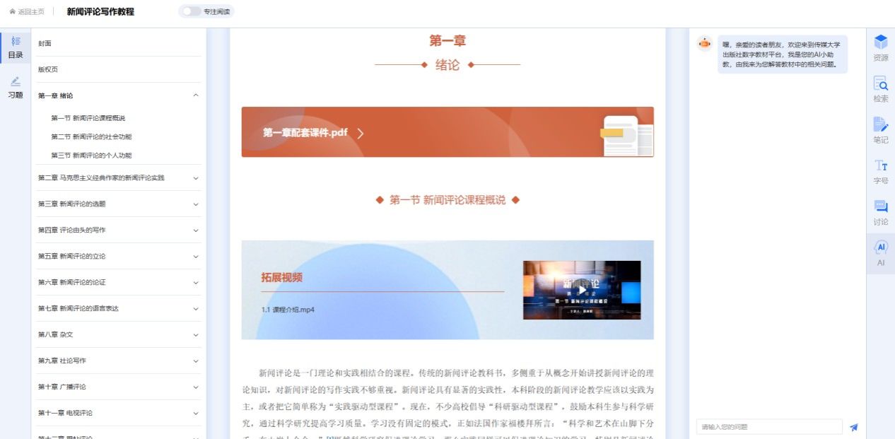 聚焦“未来课堂”打造智慧教育新范式》中,选用了《新闻评论写作教程》数字教材的界面。