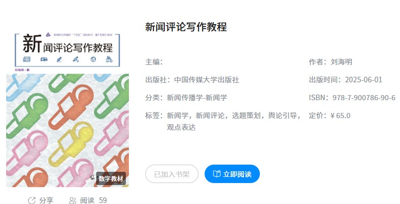 近日,中国传媒大学出版社数字部制作的《新闻评论写作教程》数字教材正式上线,这是该社第一批正式出版的数字教材。在首次6部数字教材中,刘海明教授的这本教材是新闻传播学科唯一一本专业必修课教材。
