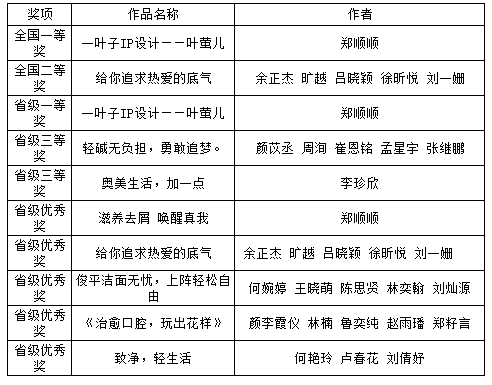 学生积极参与大广赛及公关大赛,共有15组参赛学生获奖。郑顺顺的参赛作品《一叶子IP设计——叶萤儿》在全国大广赛29个赛区1679所高校报送的481947组参赛作品中脱颖而出,获得全国一等奖。王晓萌、何婉婷、吴雨璟、蒋玉涵的参赛作品《20年,飞越喜马拉雅》从来自全国(含港、澳)及海外地区162所高校的1303个作品中脱颖而出,经三轮评比,最终斩获全国公关大赛一等奖。具体获奖明细如下: