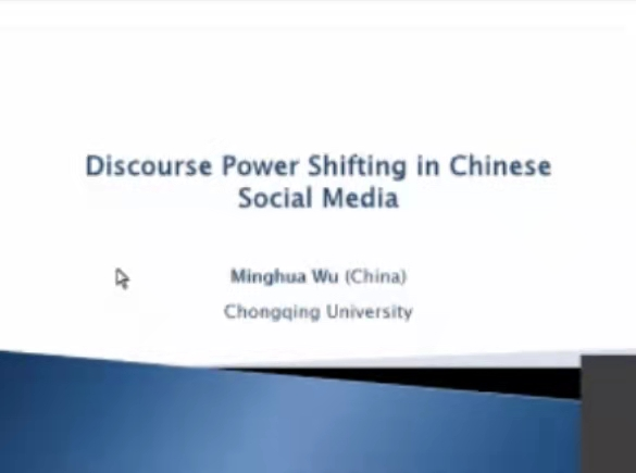 第一个研讨小组以“中国移动媒介话语权”为主题,三位学人做了学术报告。吴明华副教授以“Discourse Power Shifting in Chinese Social Media”为题,将中国社交媒体语境映射到网络公共领域中,提出了狂欢化的参与性话语(Carnivalesque Participatory Discourse,CPD)分析框架。她基于此分析框架,分析了中国社交媒体话语权的转移问题。