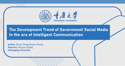 硕士生张吴越以“The Development Trend of Government Social Media In the era of Intelligent Communication”为题,从技术、平台、用户、生态四个发展维度探索了智能传播时代政务新媒体的发展趋势,回答了智能传播时代政府如何利用社交媒体将“全过程人民民主”的制度优势转化为治理效能的基本问题。