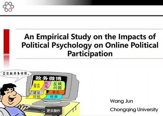 青年教师王军博士以“An Empirical Study on the Impacts of Political Psychology on Internet Political Participation”为题,探讨了中国公民政治心理因素作用于网络政治参与的机制。该研究通过对公民的各种类型网络政治参与行为影响因素的分析,发现政治心理因素是影响公民网络政治参与行为的主要因素,其中政治认知、外部效能感和政治动机等变量具有显著性影响。