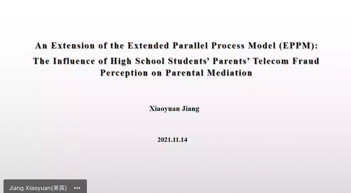硕士生姜晓源以“An Extension of the Extended Parallel Process Model (EPPM): The Influence of High School Students’ Parents’ Telecom Fraud Perception on Parental Mediation”为题,介绍了研究模型,以及在线问卷调查、量表测量的研究方法,将父母对电信欺诈的感知作为新的刺激变量,扩展了EPPM模型。该研究建议,为了更好地保护孩子,父母需要提高电信欺诈的知识和感知能力。