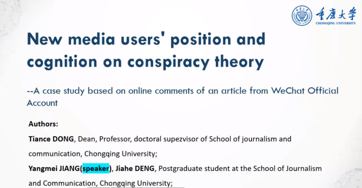 硕士生蒋阳梅以“New media users' position and cognition on conspiracy theory”为题,从新媒体用户视角出发,对《COVID-19“境外输入说”的源起及阴谋论》一文留言区的文本及点赞进行了剖析,认为新媒体用户的立场,既表明阴谋论具有广泛的民意基础,也表明人们对阴谋论的认知不够理性,甚至体现出一种当今时代的后真相症候。