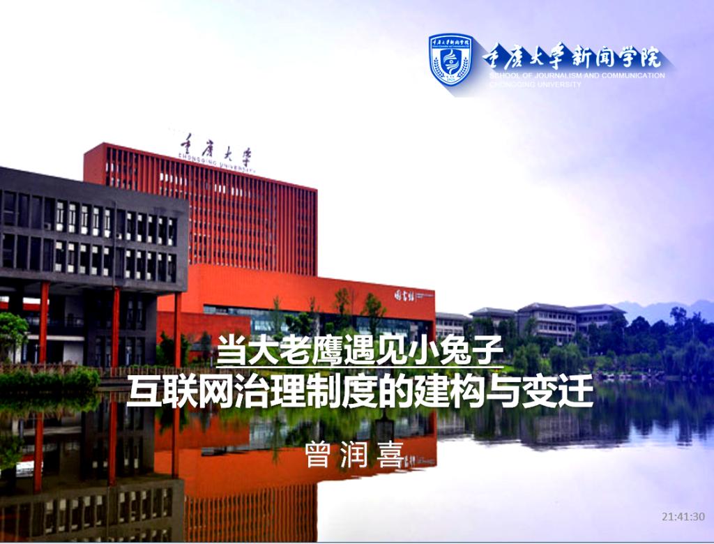 7月16日晚,网络与新媒体讲习班迎来最后一讲,曾润喜教授为全体学员带来题为“当大老鹰遇上小兔子——互联网治理制度的建构与变迁”的线上直播讲座。曾润喜教授是成人短视频