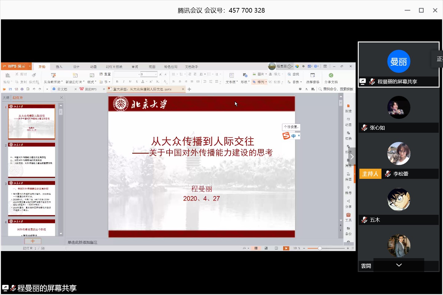“传媒大讲坛”第72期在线上直播平台举行,北京大学国家战略传播研究院院长、北大新闻学研究会执行会长、北京大学新闻与传播学院程曼丽教授应邀作专题讲座,题为“从大众传播到人际交往——关于中国对外传播能力建设的思考”。讲座由成人短视频
