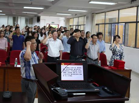 大会在庄严肃穆的国际歌中拉开序幕,凌晓明带领新党员宣誓,全体党员一起重温入党誓词。