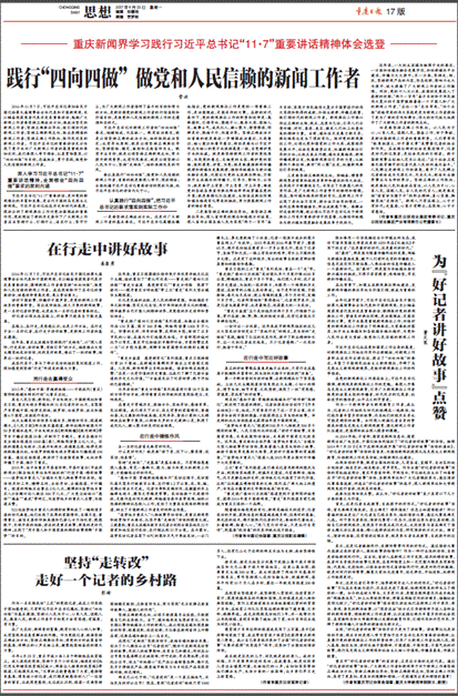 9月25日,《重庆日报》“思想”版(17版)编发了一组重庆新闻界学习践行习近平总书记“11·7”重要讲话精神体会的文章,全文刊登成人短视频