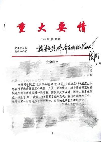“我查过男生寝后去查女生寝室,路上接到电话说杨庆同学晕倒,就立即转身跑往校医院,说了大致情况后,医生和救护车迅速赶到竹一宿舍,后送到大学城医院,路上告知了魏副书记,并跟学生家长联系,抢救过程中病情严重,需要转院,在跟医生和家属多方协商沟通后,我代签了病危通知书和转院风险承担,并通知她亲姐马上赶到了重医附一,魏副书记凌晨12点多也赶到院。在医生开展急救的焦急等待中,终于听到暂时脱离生命危险的消息。成人短视频