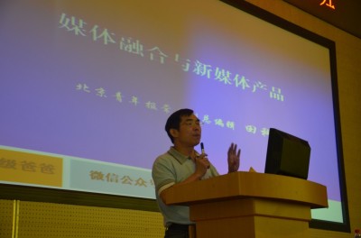 田科武老师从当前移动互联网的大环境讲起,讲述互联网及智能移动终端的普及深刻地改变了人们与信息、与媒介的关系,人们对传统媒体的信息需求大量萎缩,传统媒体满足人们信息需求的能力严重缩水,传统媒体的平台价值急剧贬值。在广告营收持续下滑成为自然而然的事情的情况下,田科武老师认为传统报业长期依赖的“内容+广告”模式正在被颠覆,顺应读者大量迁移到各种移动终端的趋势,用新技术改造传统报业,走媒体融合之路,是传统媒体迫不得已的必然选择。