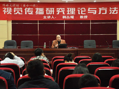 院长董天策教授的主持下,韩丛耀教授开始了本次题为“视觉传播研究理论与方法”的讲座。韩教授着重阐述了以下六个问题:一、视觉图像的三性表征,包括迹象性图像、相似性图像、象征性图像。二、视觉传播的三种形态,即技术性形态、构成性形态和社会性形态。三、视觉阐释的三个场域——图像的生产技术场域、图像的自身构成场域、图像的社会传播场域。四、视觉传播研究的具体内容,包含图像的构成、图像的本质、图像与意义、图像与艺术等多项内容及其相互关联。五、视觉传播研究的具体方法,主要有图像学分析法、构成性诠释法、符号学分析法等十种研究方法。六、视觉传播研究的三个面向:一是面向视觉传播的理论研究,二是面向视觉传播的实务研究,最后是视觉传播的研究者应有人文艺术素养。