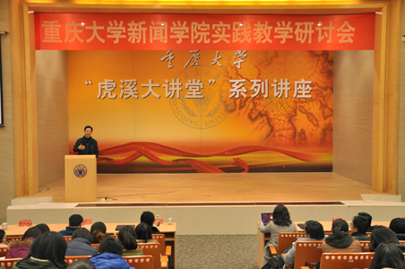 深圳大学传播学院教授王晓华则以“开放式、自主性、实践型新闻传播学创新实践体系探索与建设”为题,与大家交流探讨了传播实践教学路径和发展趋势。她指出深圳大学传播学院的传媒实践依托深圳蓬勃发展的文化产业环境,根植产学研结合、校企、校政合作平台,培养出了一大批优秀的传媒人才。她从自己与重庆的渊源谈起,逐步引出深圳大学传播学院的实践教学模式,“深圳大学传播学院从学生作业到作品再到产品,一步步发展出了规模化体系化的教学模式。”通过PPT,王晓华向大家介绍了深圳大学传播学院传播实践教学模式的尝试与成就。谈到深圳大学传播学院实践教学理念,她这样阐述道:“树立了‘素质为本,技能为用,学用贯通,创意实践’的传媒实践教学理念,以‘创意实践’为枢纽,将素质、知识、技能三个要素整合,以大批培养社会急需的传媒创意人才为旨归。”同时,她也一再强调了团队合作的重要性:“我们学院从大一开始就鼓励同学们进行团队合作,很多团队最后甚至自主创业开办公司。并且,我们的教师也是团队教学。”