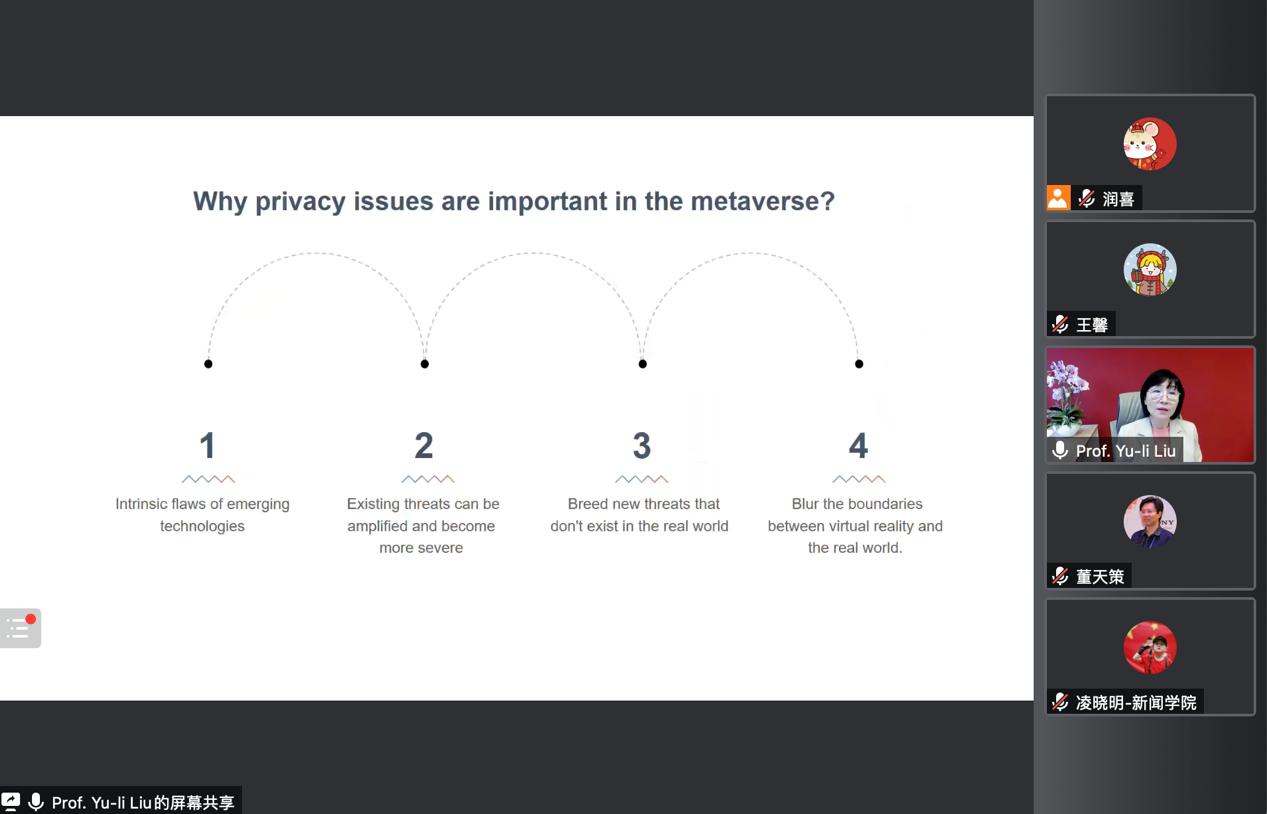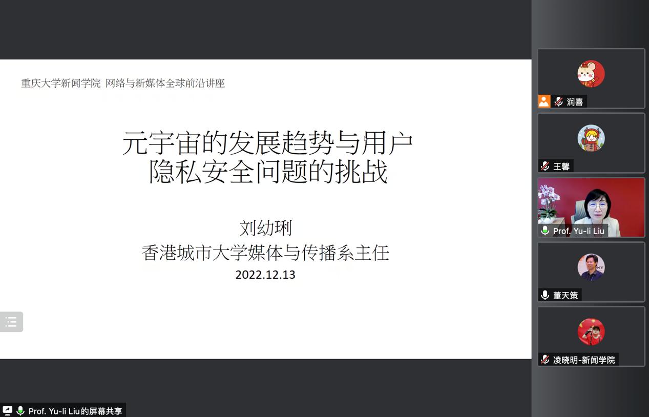 12月13日下午,香港城市大学媒体与传播系主任刘幼俐教授为第八期“网络与新媒体讲习班”全体学员做了题为“元宇宙的发展趋势与用户隐私安全问题的挑战”的专题讲座。来自全国各大新闻传播院校和新媒体业界的近千名学员共聚云端学习研讨,讲座由成人短视频