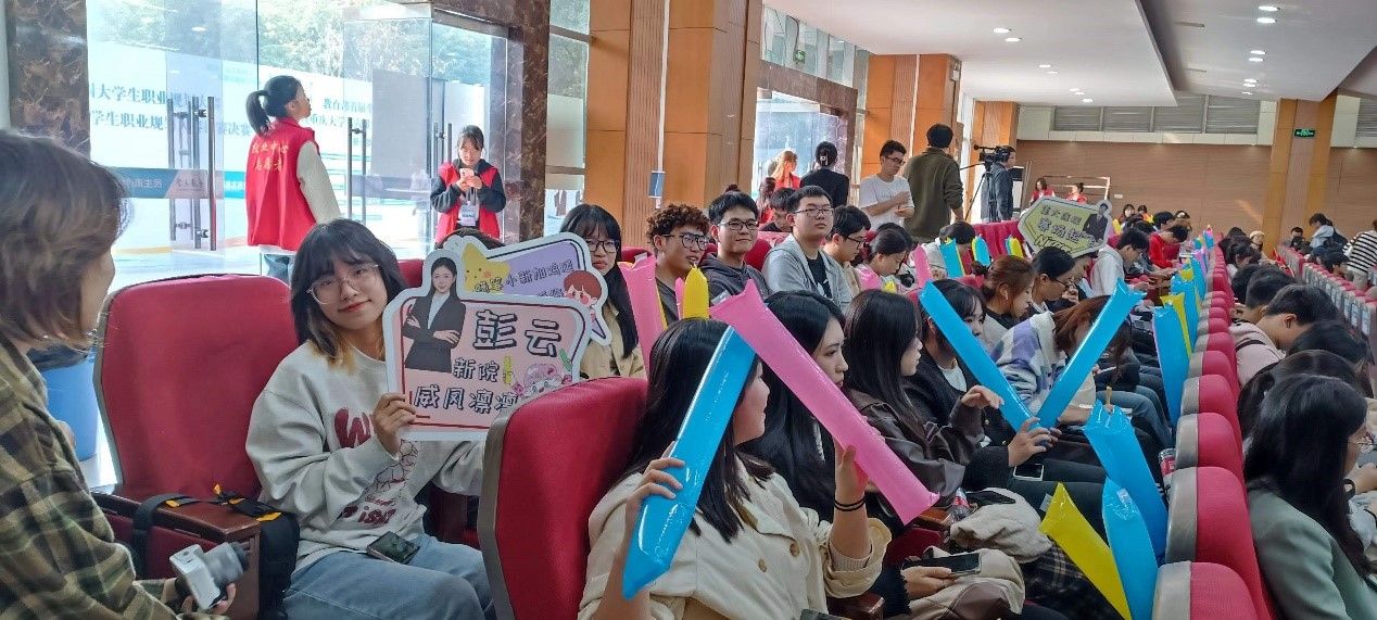 9位选手在六千余人中脱颖而出,本科生彭云、陈静怡、陈思杨、崔文波入围成长赛道全校三十强复赛,硕士研究生牛乔飞、李云帆、陶思阅、杨沁和文一入围就业赛道全校三十强复赛。本科生彭云、研究生牛乔飞成功晋级最终决赛,选手所在班级同学自发组成助力亲友团,在比赛现场为两位选手加油打气,传递了来自学院的温暖。