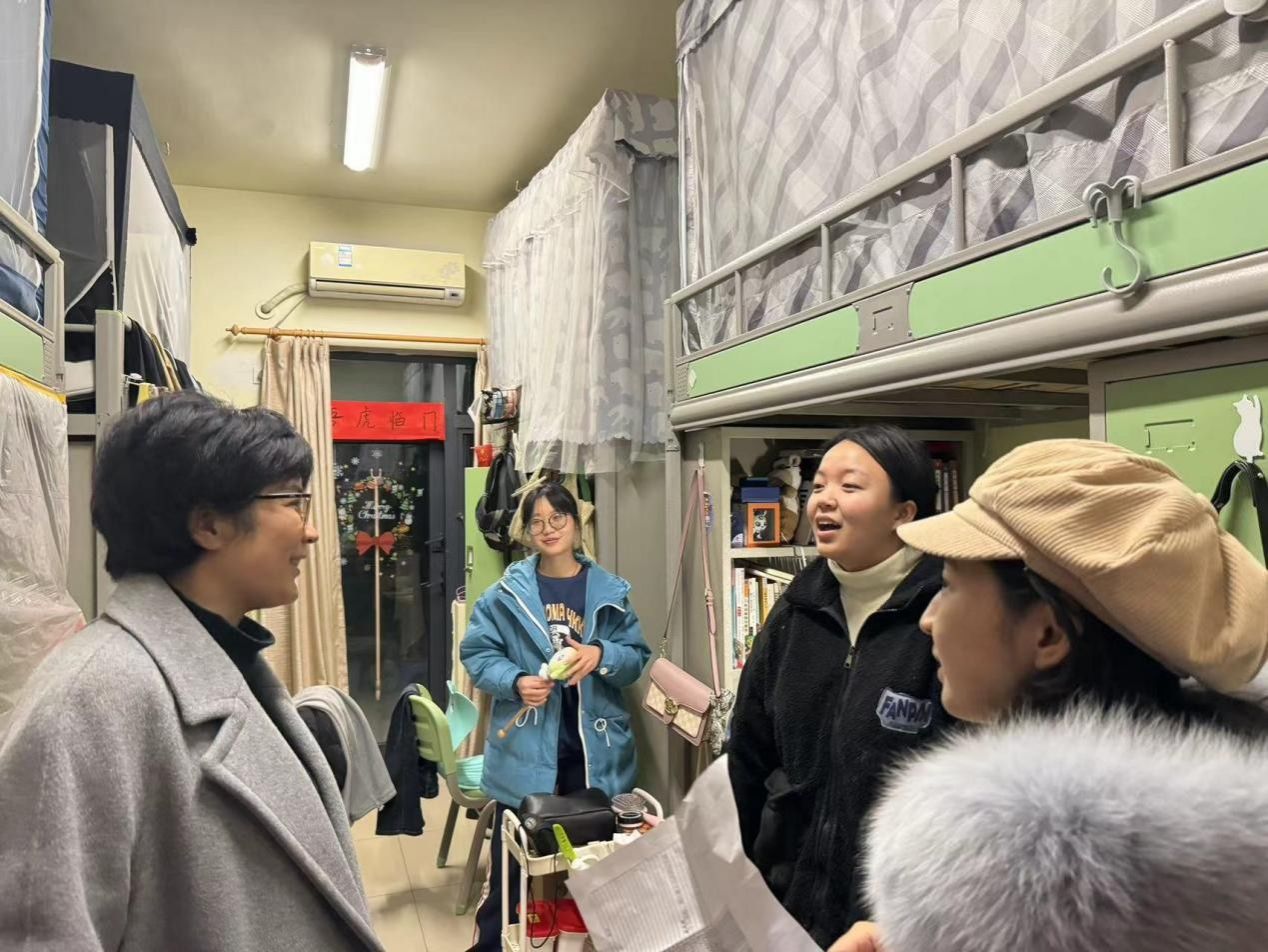 党委副书记陈娜,学办主任赵秋莹,辅导员李朗、吴昆,于2月27日晚到学生宿舍开展走访工作。