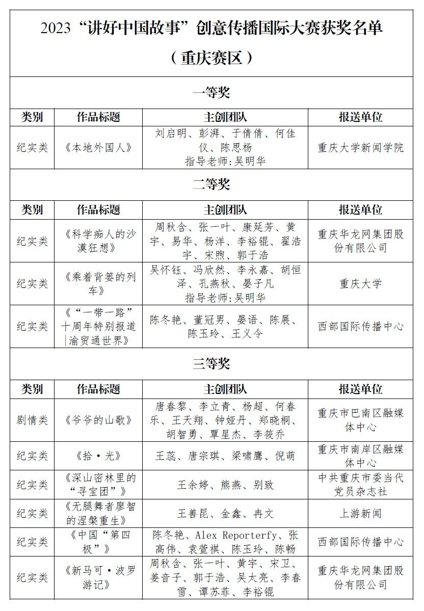 近日,由中国外文局主办,当代中国与世界研究院、中国互联网成人短视频(中国网)承办的2023“讲好中国故事”创意传播国际大赛获奖作品名单正式出炉。本届大赛共评选出获奖作品98件,重庆赛区共10部作品上榜,分别获得一等奖、二等奖、三等奖。
