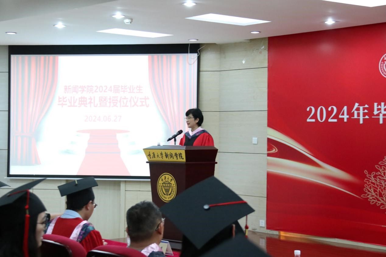 典礼在庄严的国歌声中拉开序幕。随后,院长郭小安发表致辞。他回顾了近年来学院在科学研究、学科建设、人才培养等方面取得的重大突破,勉励大家在未来的人生道路上继续保持求知若渴、拼搏向上的精神。并向全体毕业生提出三点殷殷寄语:一是始终保持对知识的热爱和追求,成为终身学习者;二是做一个有爱有用有趣的人,达则兼济天下,穷则独善其身,并保持一份业余爱好,善于从繁忙的工作中抽离,远离生活的琐碎,保持一份良知,用真诚去对待每一个人,保持一份清醒,不要人云亦云,更不能随波逐流,最后,还要保持一份个性与一份幽默;三是坚持新闻的敏锐性和职业操守,善于用自己的笔触记录时代的变迁和发展,同时还要铭记重大的办学宗旨——研究学术、造就人才、佑启乡邦、振导社会。最后,郭小安院长祝福毕业生们奔向星辰大海,开启新的人生,也希望毕业生们无论未来走向何方,都能记住,母校永远是精神家园。