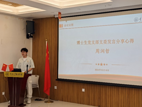 博士生党支部委员黎一达同志、周润哲同志在此次会议的发言分享环节中从自身经验出发,为四位支委候选人就如何做好支部建设提出了有效建议。发言中,两位同志还对今后不断加强博士生党支部与研究生各个支部之间的联系,发扬“传“”帮“带”精神的愿景提出了殷切期盼。